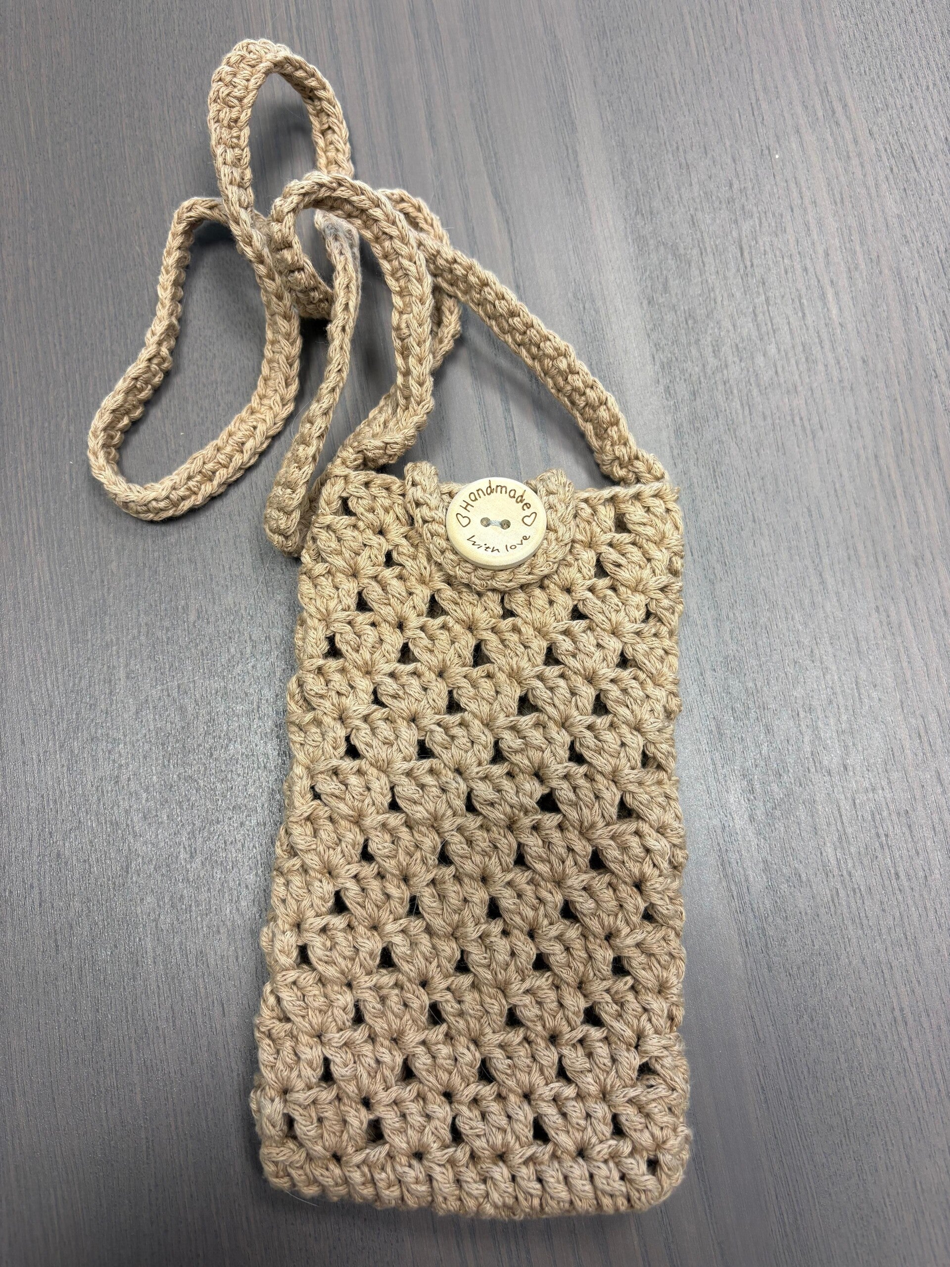 In filato morbido, con tracolla e bottone in legno per chiusura. Adatto a tutti i tipi di cellulare